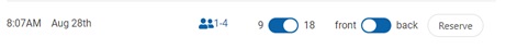 After selecting a date, you will have times available. Each time has options to select from: 1-4 means that up to four slots are open, while 9 or 18 means that you may choose to play either 9 or 18 holes. Same with front or back: you are choosing to start either on Hole #1 or Hole #10. Press the Reserve button to move on in the reservation system.